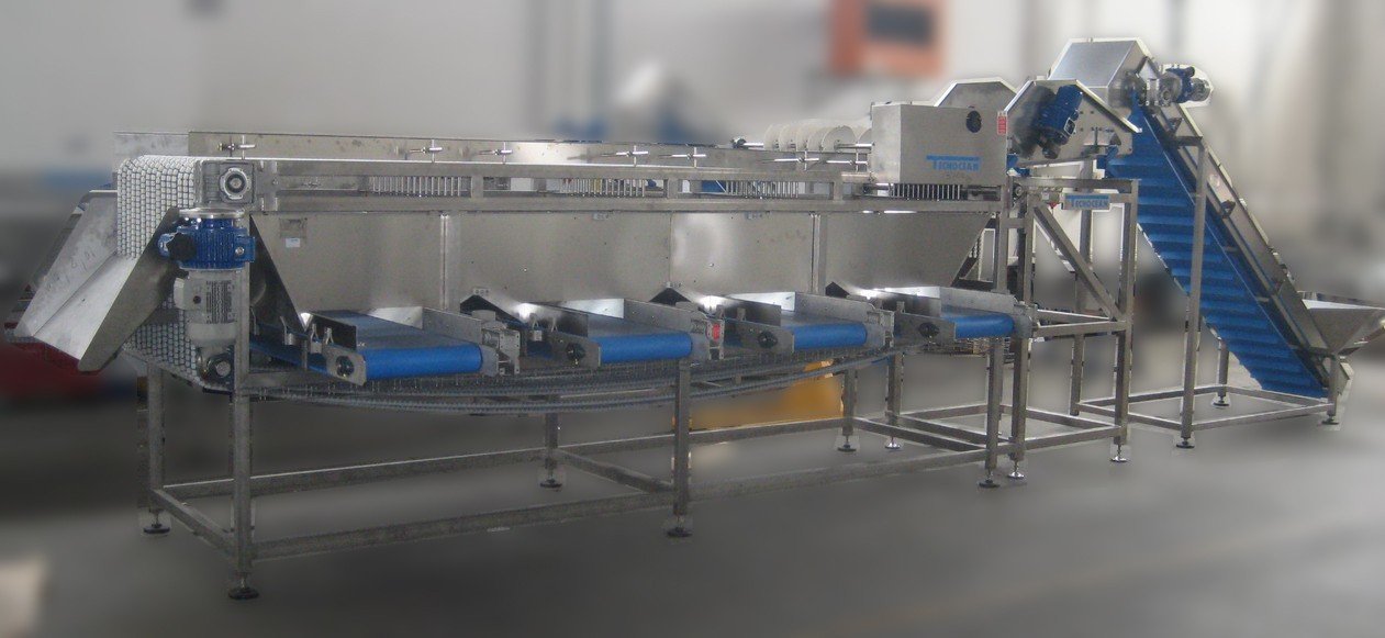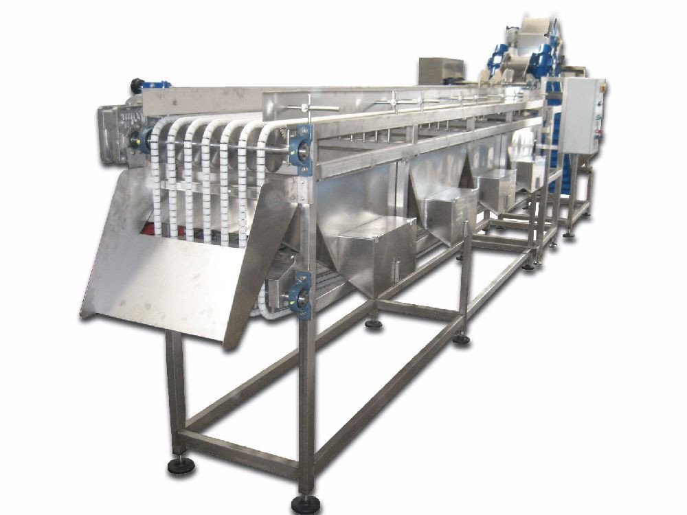Sotto alle catene sono sistemate delle tramogge di raccolta prodotto in funzione del numero di calibri che si vuole ottenere che scaricano su nastrini di uscita.