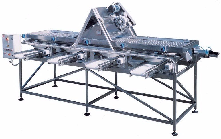 L’avanzamento del prodotto è ottenuto tramite un vibratore. Sotto alle catene sono sistemate delle tramogge di raccolta prodotto in funzione del numero di calibri che si vuole ottenere che scaricano su nastrini bidirezionali che portano il prodotto direttamente sui bin o su richiesta su delle bilance .equipaggiate con celle di carico.