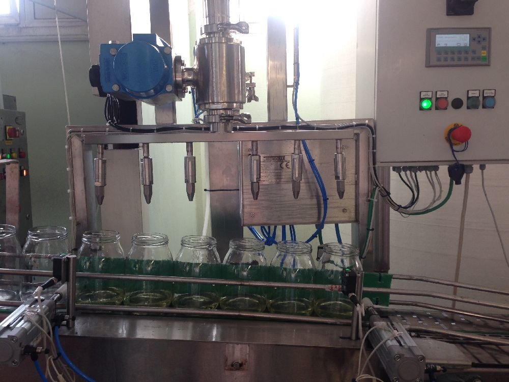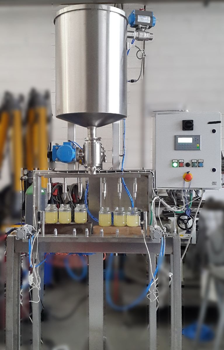 Dosatore volumetrico idoneo al dosaggio di liquidi tipo olio, sciroppi ed acqua trattata, in grossi vasi, prima del riempimento con vegetali in pezzi.