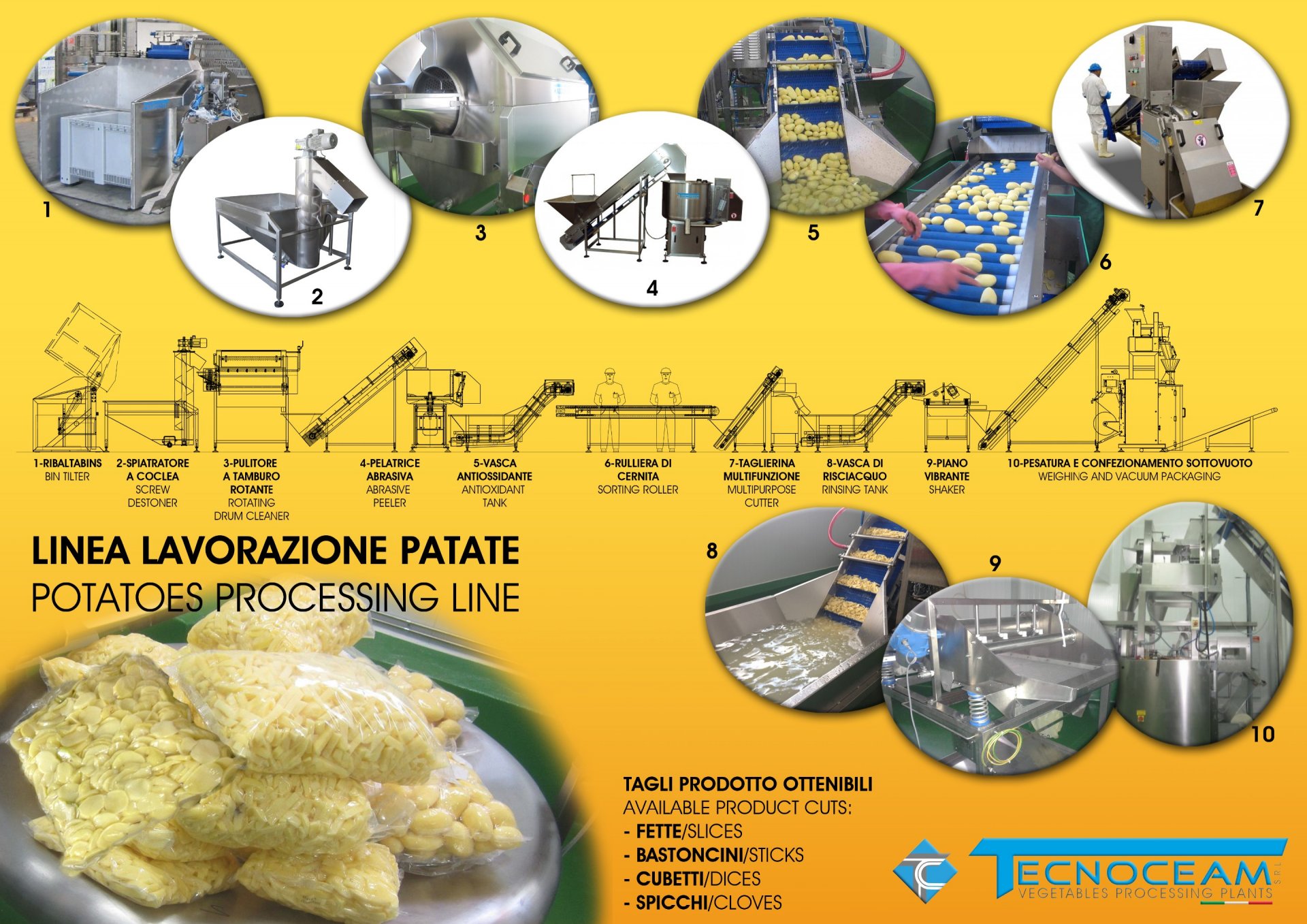Linea progettata per lavare le patate, pelarle, ispezionarle, tagliarle, sottoporle a trattamento antiossidante, confezionarle sottovuoto oppure dirigerle verso macchinari per tipologie di cottura e conservazione diverse.