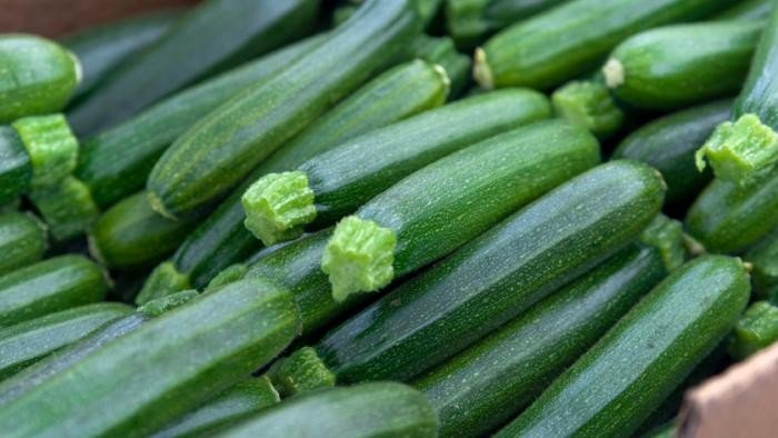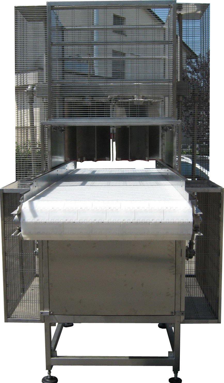 Le zucche, melanzane, zucchine, avanzano con nastro continuo sotto alla testata di taglio.