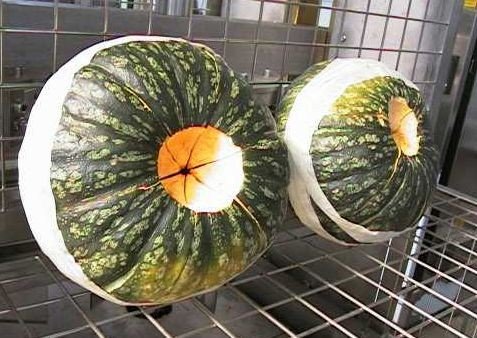 Un coltello verticale taglia le zucche a fette ( 4-6 fette ) e una fresa dal basso ( opzionale ) detorsola il picciolo.