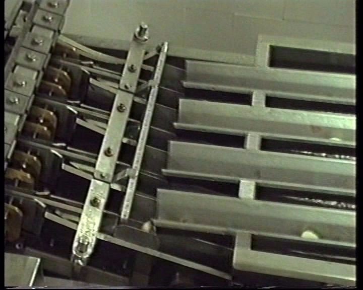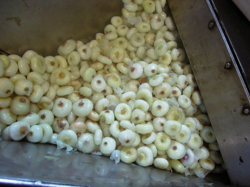 Le cipolle sono spinte da catene con supporti in teflon contro la zona di taglio.