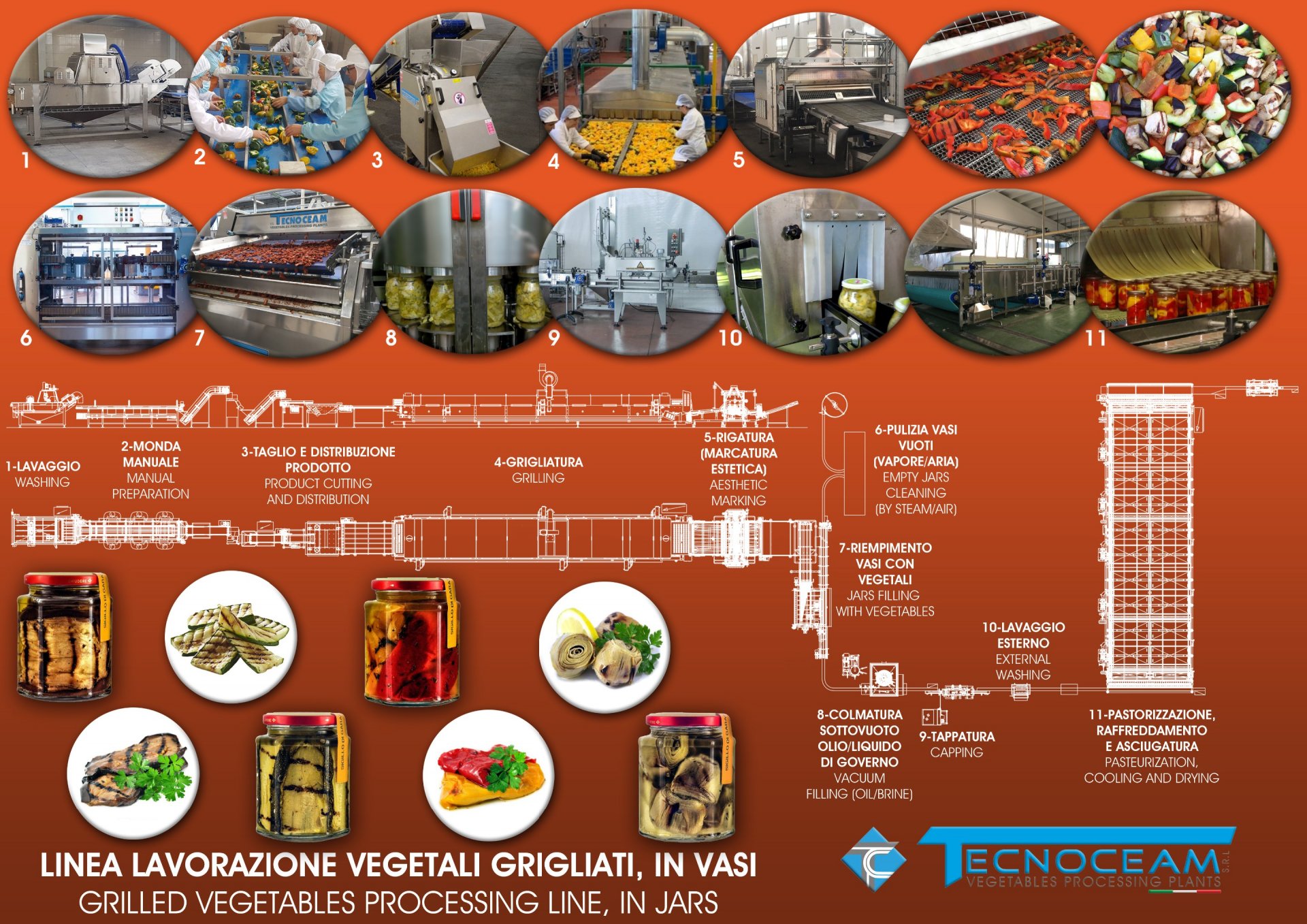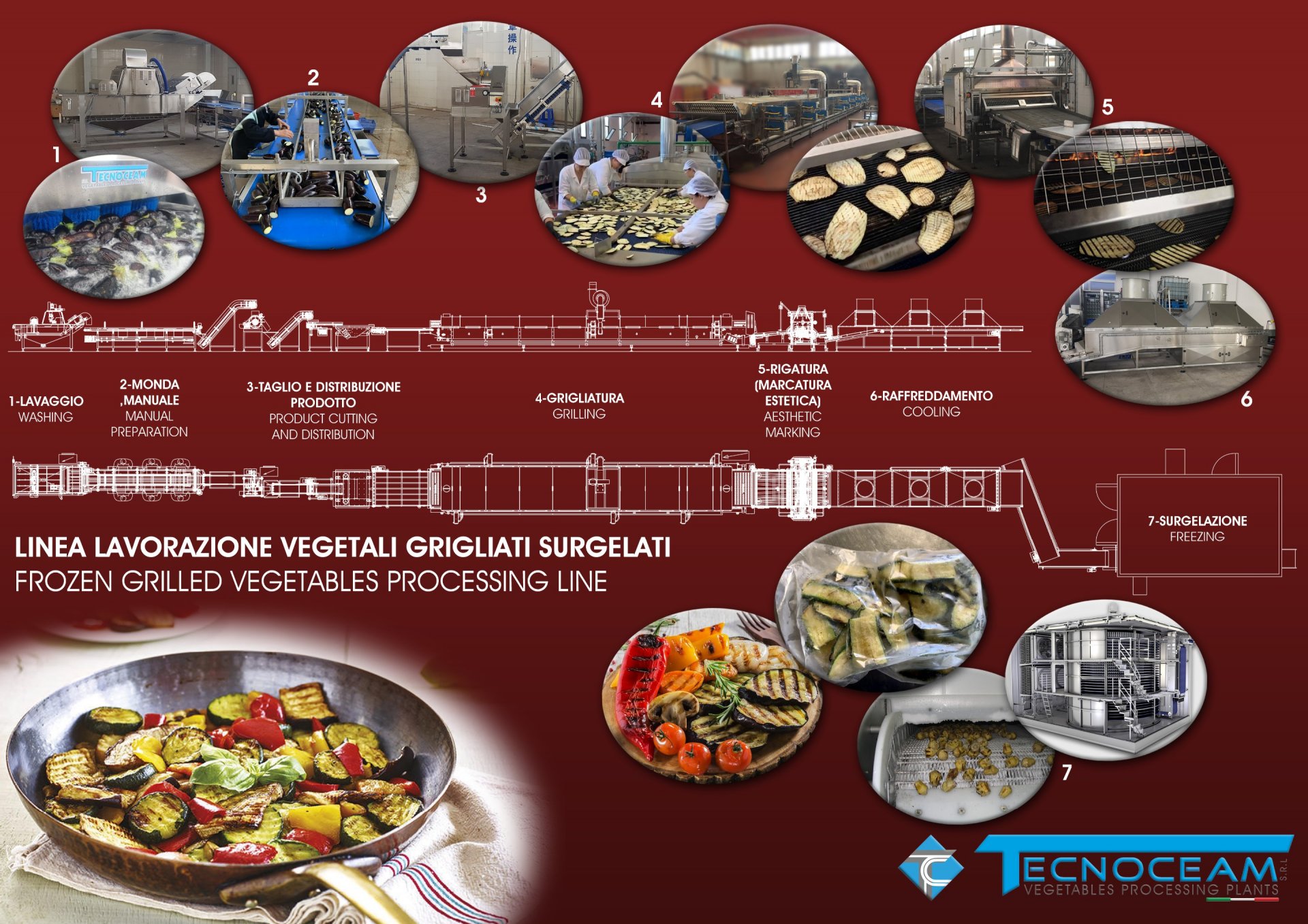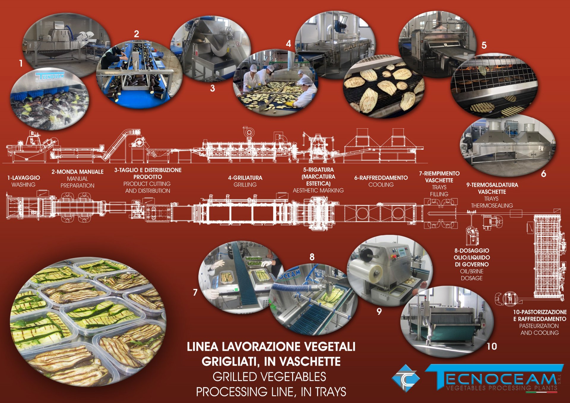 Linee complete per lavaggio / taglio / grigliatura / raffreddamento / confezionamento ecc. di verdure destinate alla surgelazione / alla conservazione sottolio/sottaceto / pronte da consumare fresche in vaschette da banco frigo.